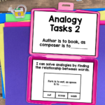 Given written analogy statements, the student will independently identify the correct relationship between words to complete each analogy with 80% accuracy across 3 consecutive sessions, as measured by teacher-created task box data.