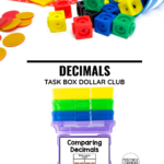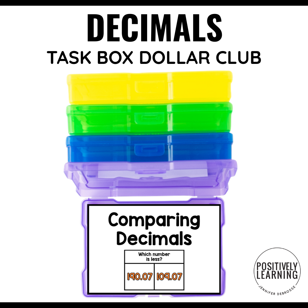 Given pairs of decimal numbers, the student will independently compare the values and identify which number is greater, less than, or equal with 80% accuracy across 3 consecutive sessions, as measured by teacher-created task box data.