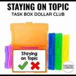 Given a topic prompt and multiple response choices, the student will independently identify or produce responses that stay on topic during speaking or writing tasks with 80% accuracy across 3 consecutive sessions, as measured by teacher-created task box data.