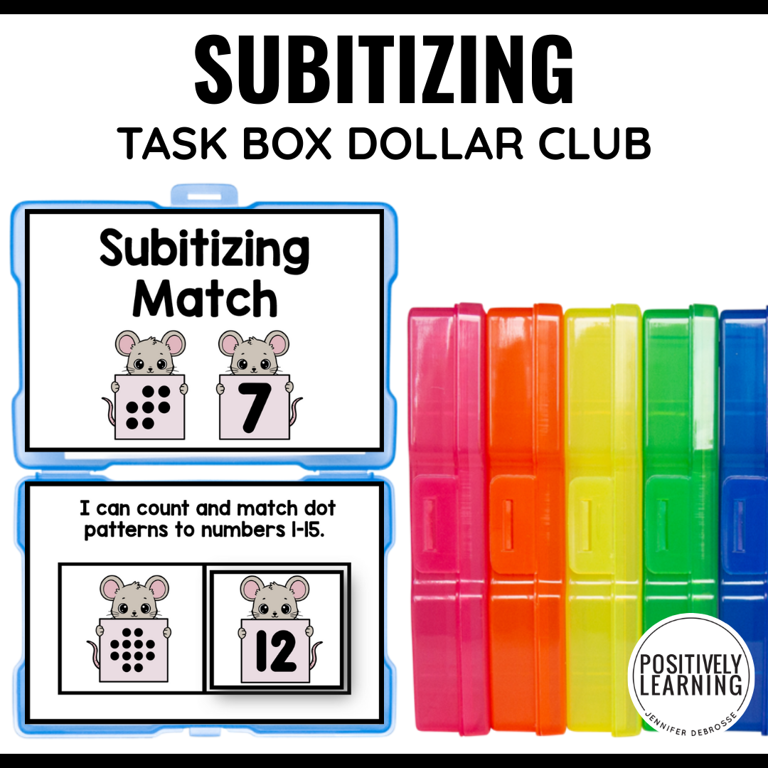 Given subitizing dot cards (1–15) and matching numeral cards, the student will independently match each dot pattern to the correct number with 80% accuracy across 3 consecutive sessions, as measured by teacher-created task box data.
