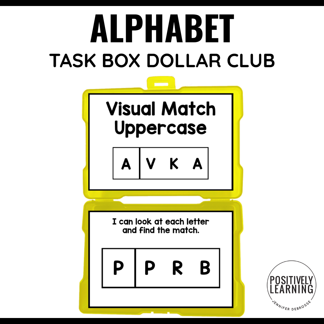 Given a set of uppercase letters, the student will independently visually match identical letters to demonstrate letter recognition with 80% accuracy across 3 consecutive sessions, as measured by teacher-created task box data.