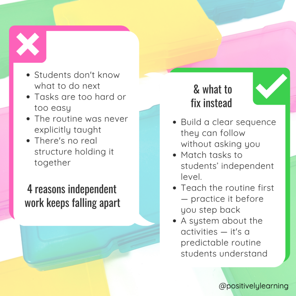 The routine hasn't been taught. Independent work isn't something students just figure out on their own. The routine — where to get the work, how to do it, what to do when they're finished — has to be explicitly taught and practiced before it becomes something students can do without you.